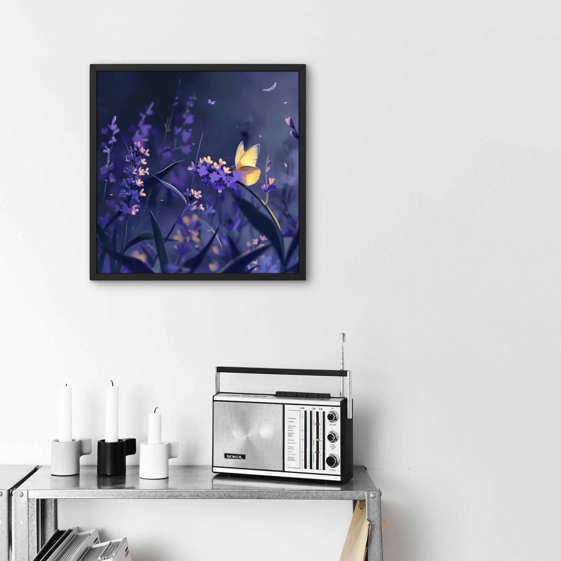 The backdrop, shrouded in darker hues, serves as a canvas that amplifies the butterfly and flower’s brilliance. The lavender-hued blossom, with its distinctive shape, exudes elegance and tranquility. Outdoors, where light and shadow dance, the composition gains depth, emphasising the butterfly’s yellow tones against the dusky background.