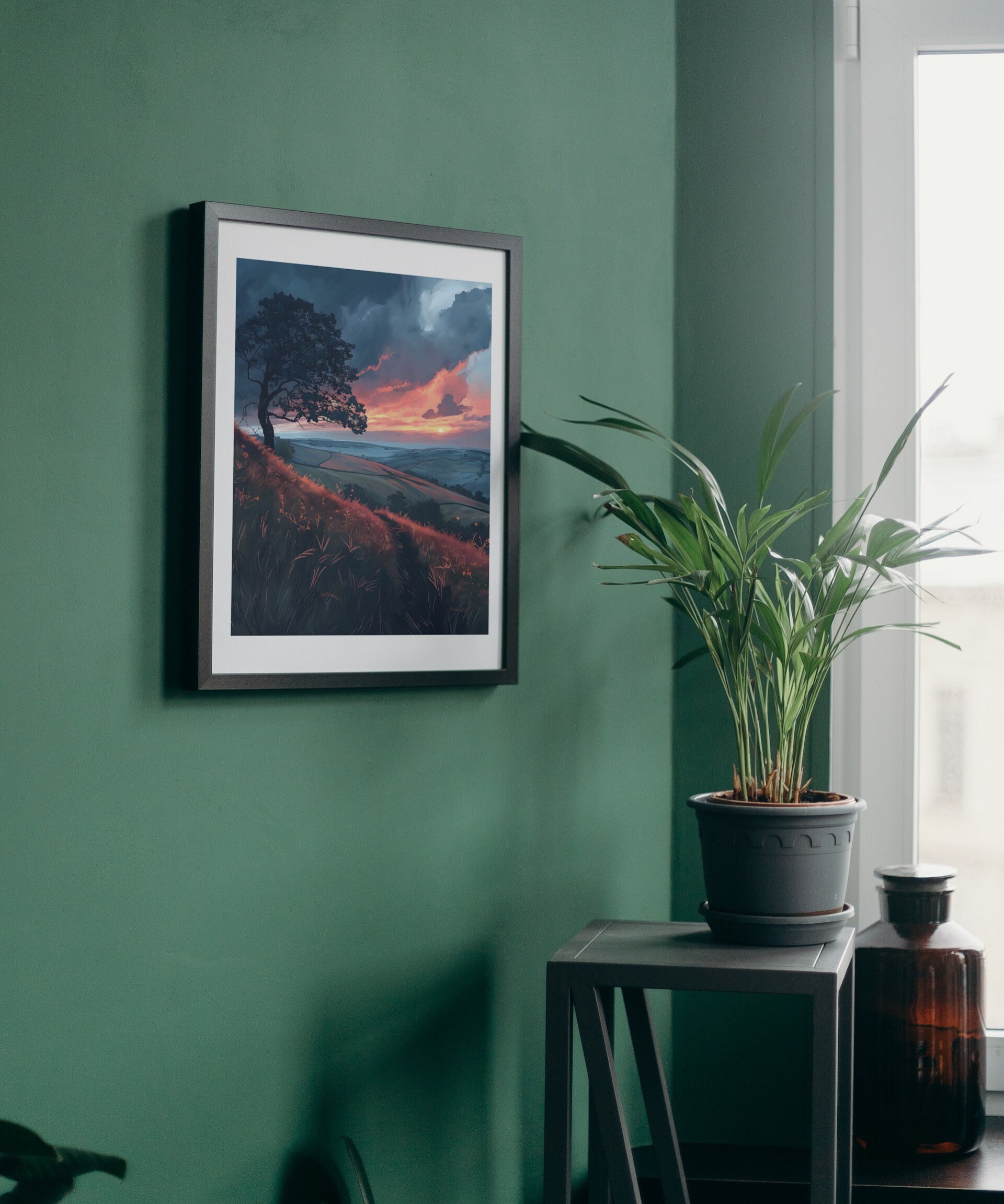 In this stunning landscape print, a lone tree stands atop a rolling hill, commanding the attention of the viewer. As the sun sets in the background, the tree is bathed in a warm, golden light, casting long shadows across the grassy field.