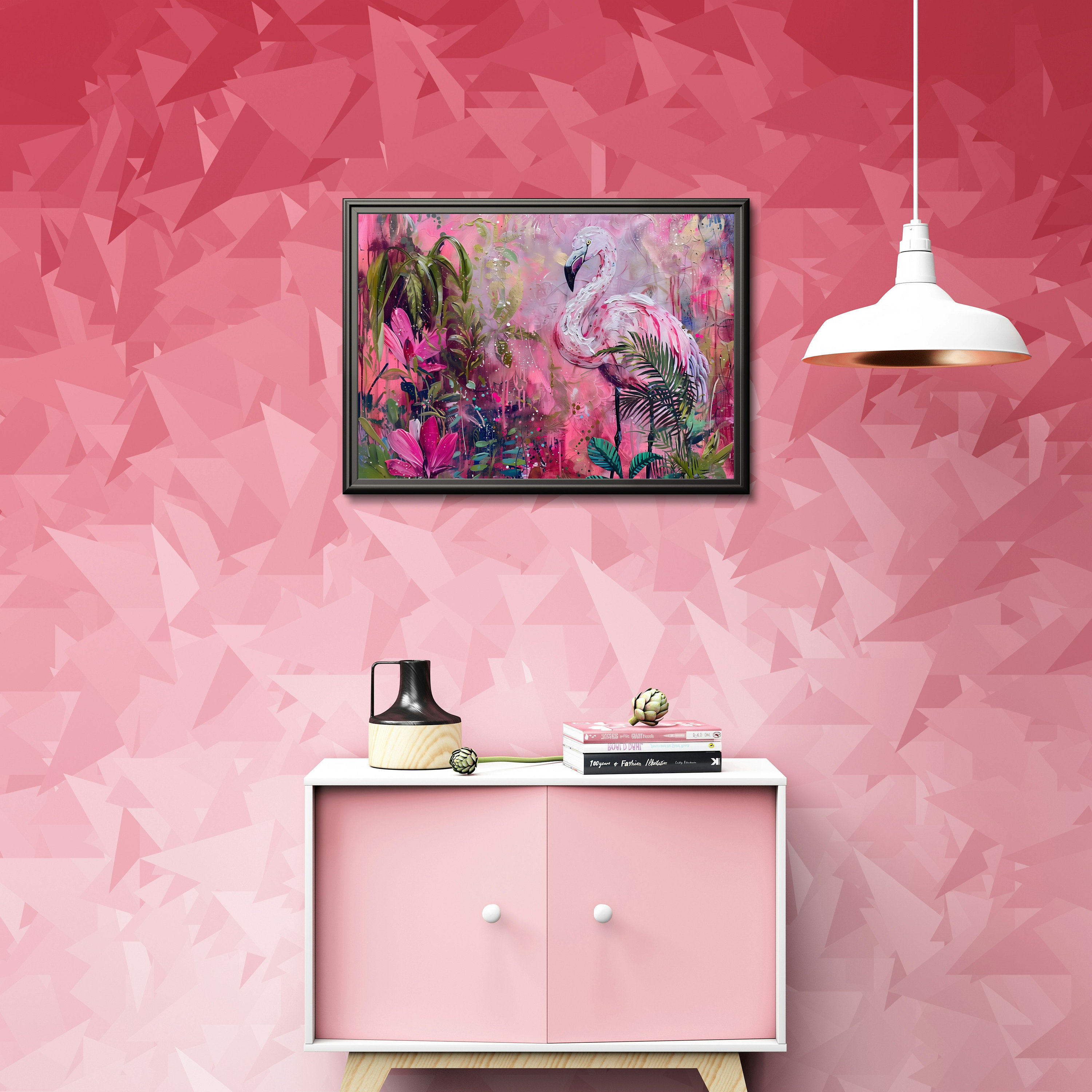 This vibrant artwork showcases a striking flamingo amidst lush plants, a captivating exploration of colour, form, and modern art sensibilities. Dominant pink hues create harmony between subject and surroundings. The flamingo's serene pose and abstract plants convey the dynamic beauty of its natural habitat. This artwork celebrates nature through a modern lens, a testament to enduring beauty.