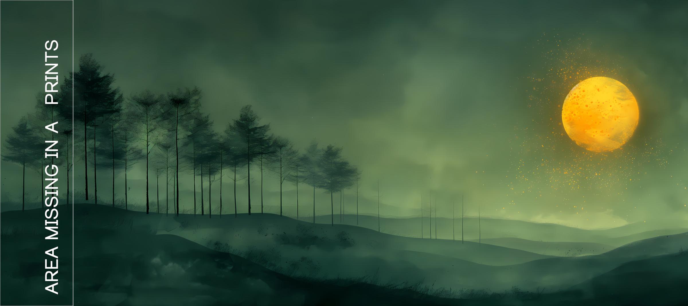 Step into a world of enchanting mystery with this digital fantasy art print. A luminous yellow moon casts an eerie glow on a mystical forest, revealing intricate details on the lush trees. Lush greens and deep shadows create a captivating atmosphere, while watercolour techniques add a touch of dreamlike quality. This high-resolution print is a must-have for fantasy art enthusiasts and anyone who loves the beauty and intrigue of the unknown.