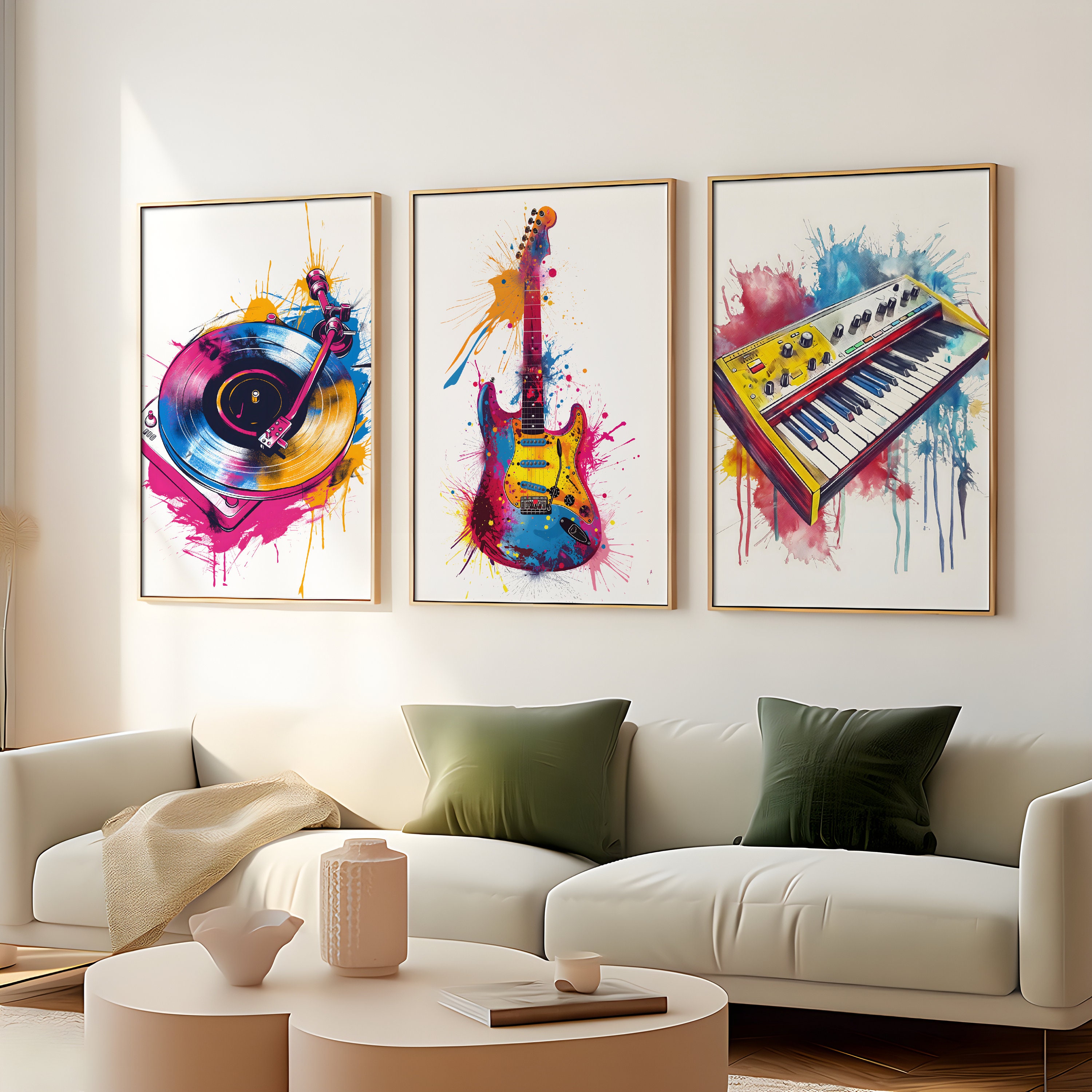 Make a bold statement with this electrifying Set of pop art poster set! Featuring a vibrantly splashed keyboard, guitar, and record player, these eye-catching prints capture the energy and excitement of music. Each poster is a unique explosion of colour and form, a perfect homage to the retro pop art era. This set is a must-have for music lovers and anyone who craves a touch of colour and conversation in their space.