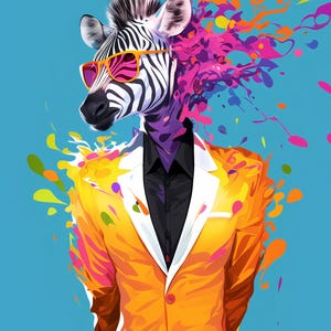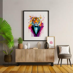 Imagine this artwork adorning your wall, adding a touch of wild style and modern art to your space. Its bold colours and striking composition will make a statement and inspire confidence. Whether you're an animal lover or simply someone who appreciates unique and eye-catching art, this piece is sure to impress.