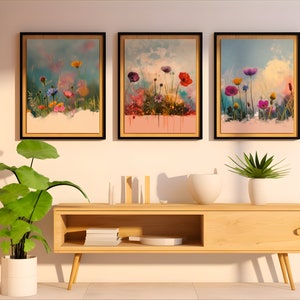 Transport your space to a peaceful and surreal landscape with this stunning abstract wall poster. This unique art print is a digital painting that captures a serene mountain view with a whimsical foreground of wildflowers. The soft, pastel colour palette of gentle pinks, blues, and yellows, combined with the large, fluffy clouds, creates a tranquil and dreamy atmosphere. The stylised flowers and misty hills evoke a sense of quiet magic, perfect for adding a touch of artistic calm to any room.