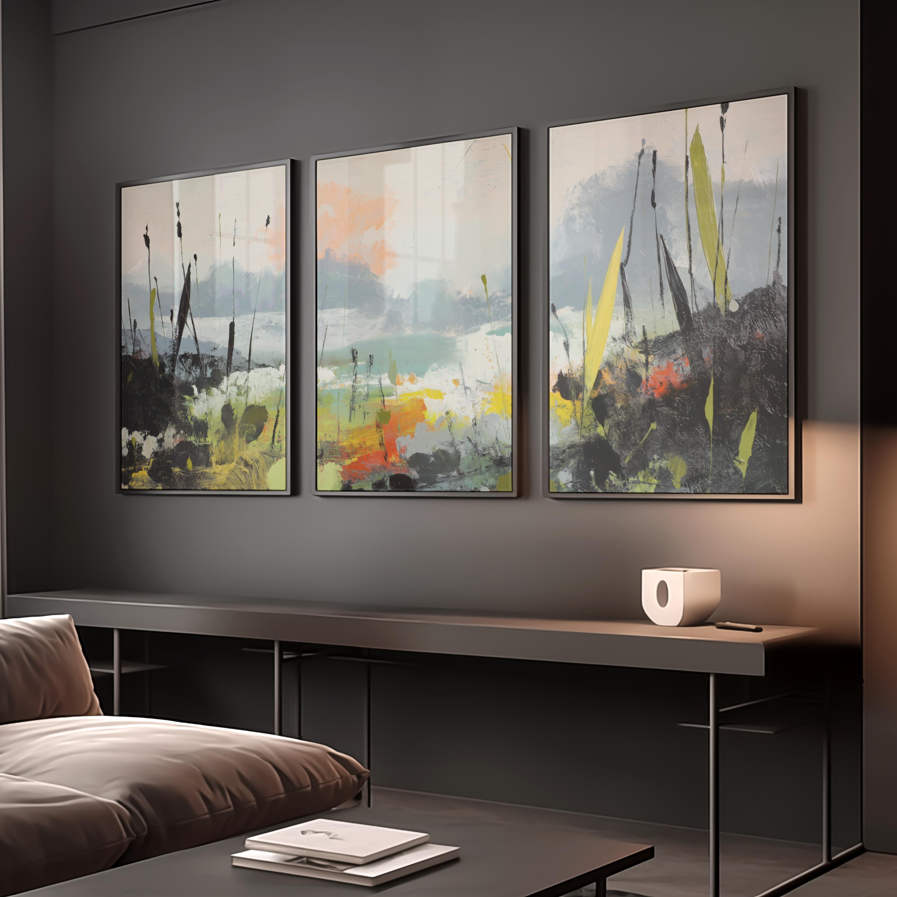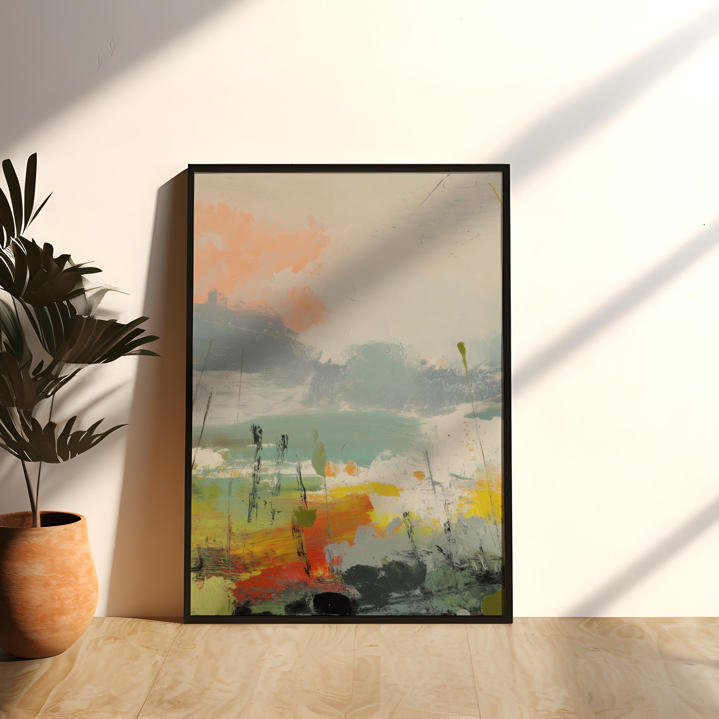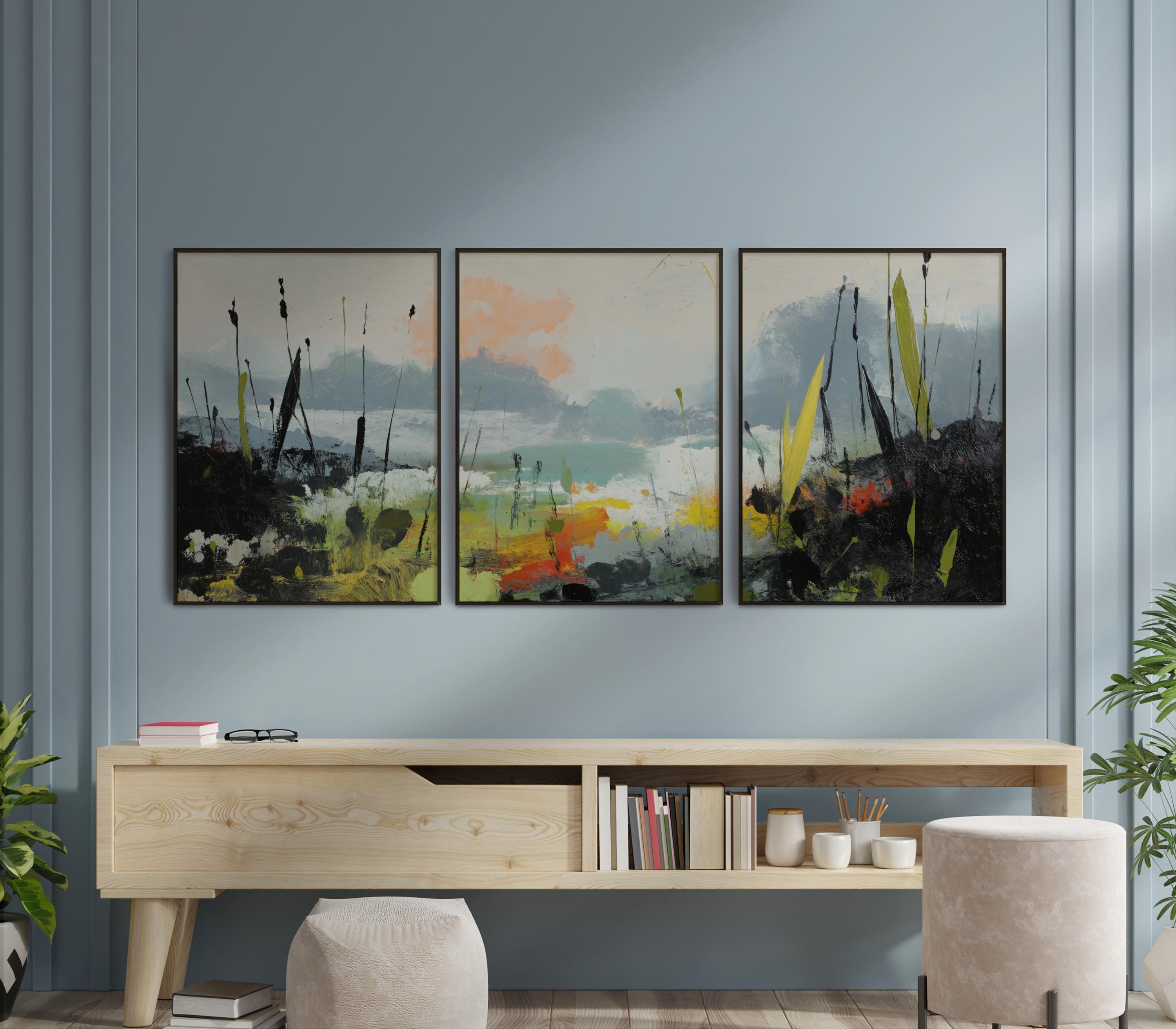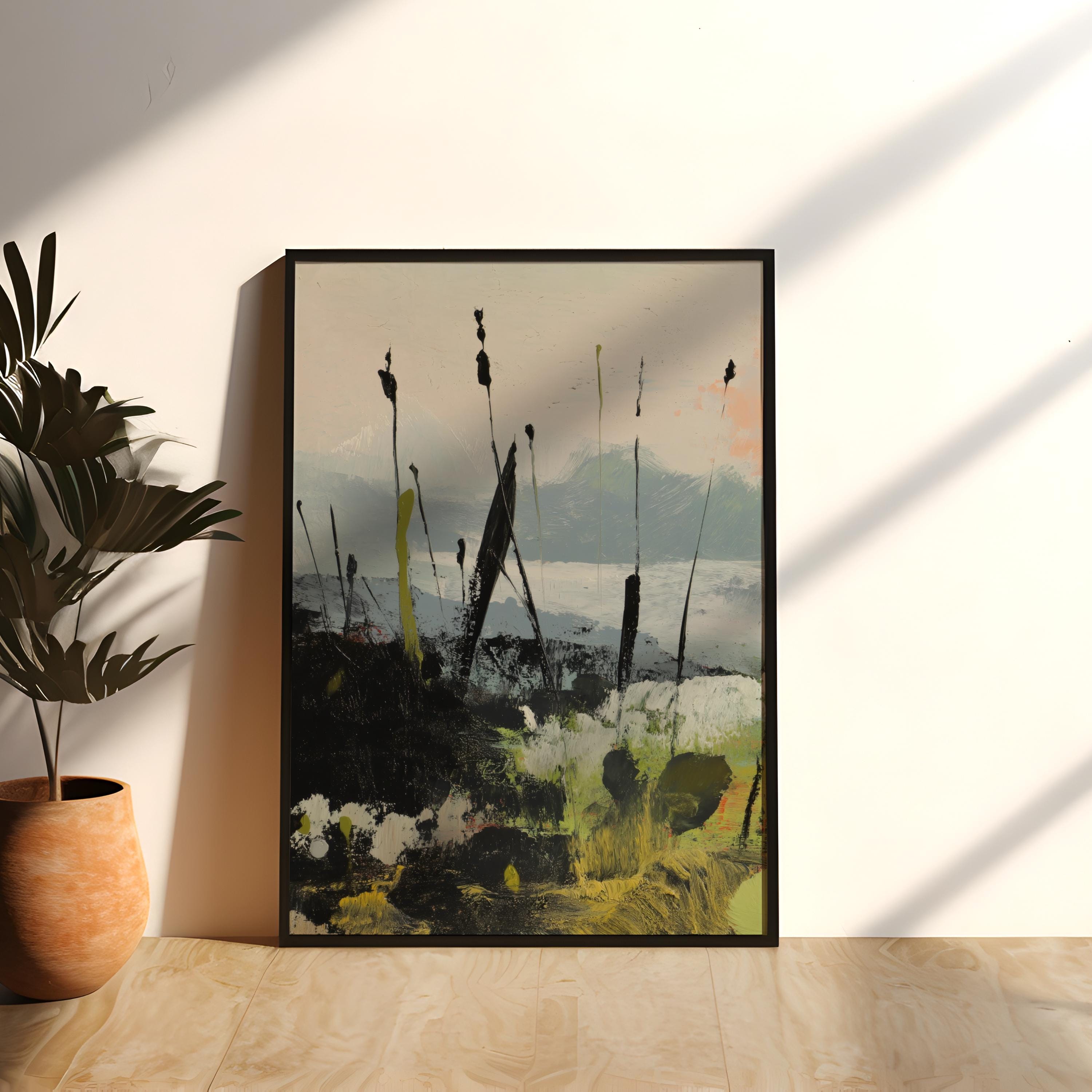 This contemporary abstract landscape captures the ethereal atmosphere of a misty morning over the marshlands. With a sophisticated palette of moss greens, deep charcoals, and a striking touch of sunset orange, this piece serves as a captivating focal point for any modern interior.