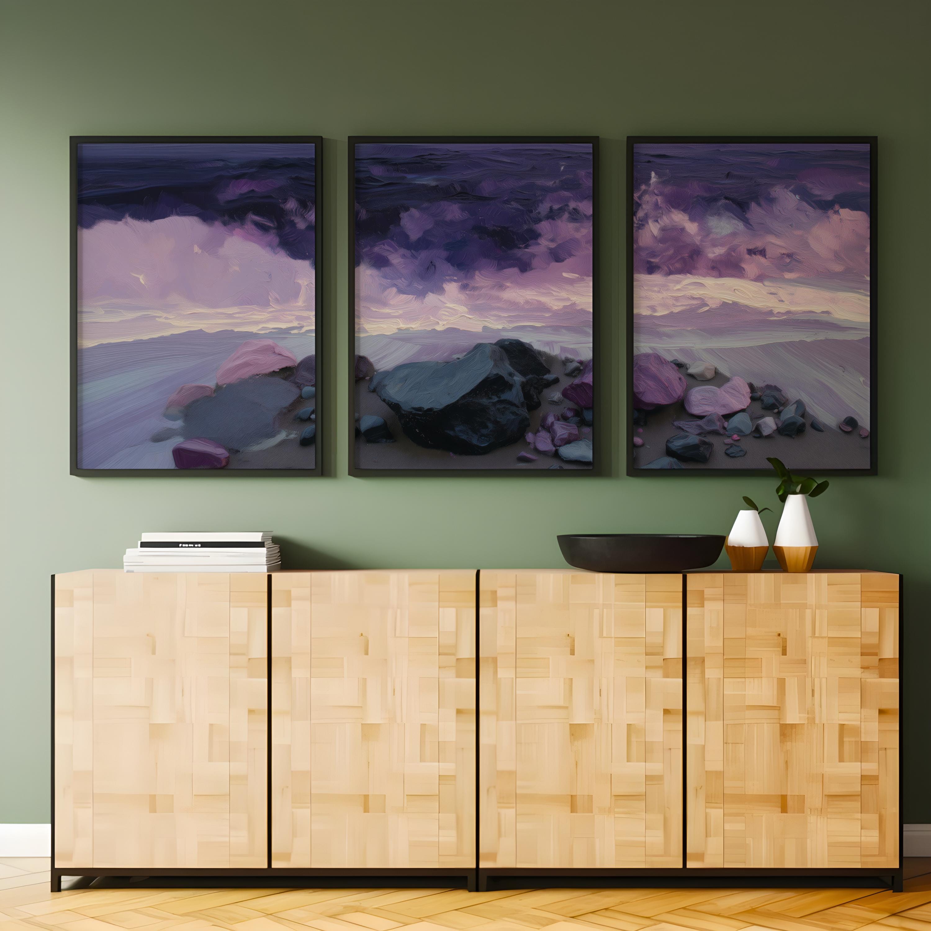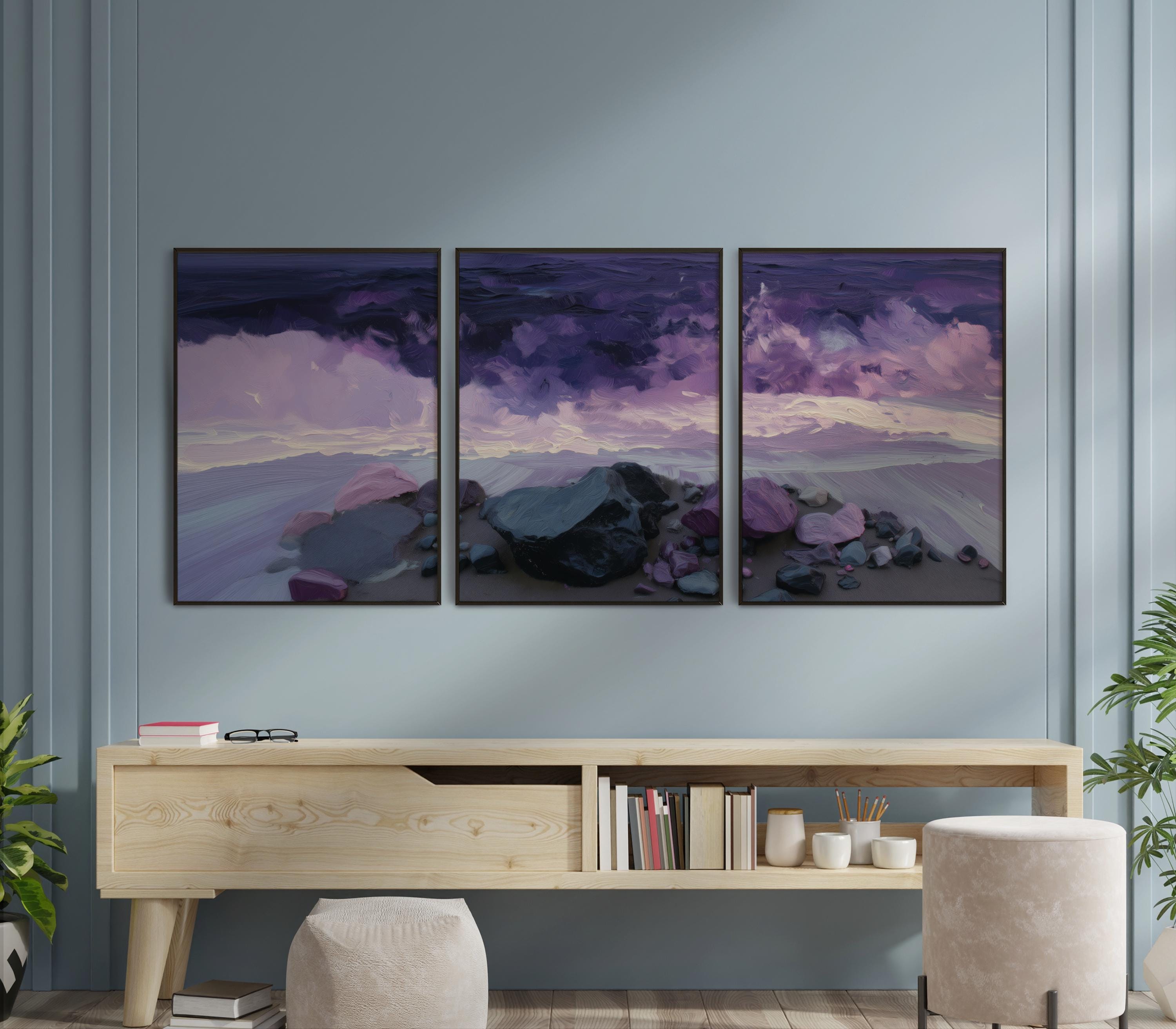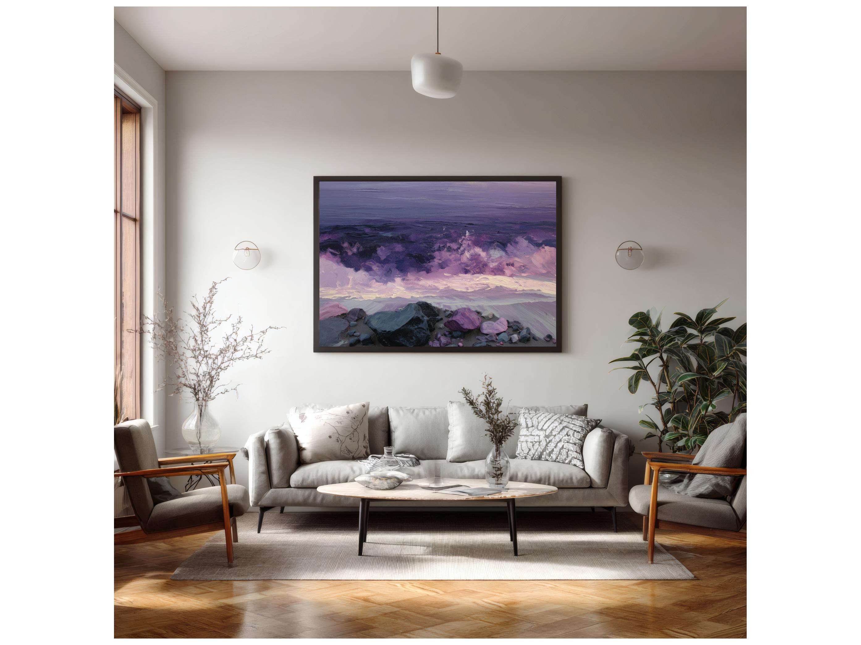 The palette transitions from deep eggplant to soft lilac, making it a sophisticated poster for a living room or creative home office. Whether you are looking for a unique home decor gift or a statement moody wall art piece for a feature wall, this high-quality coastal decor brings a sense of drama and artistic flair to your space.