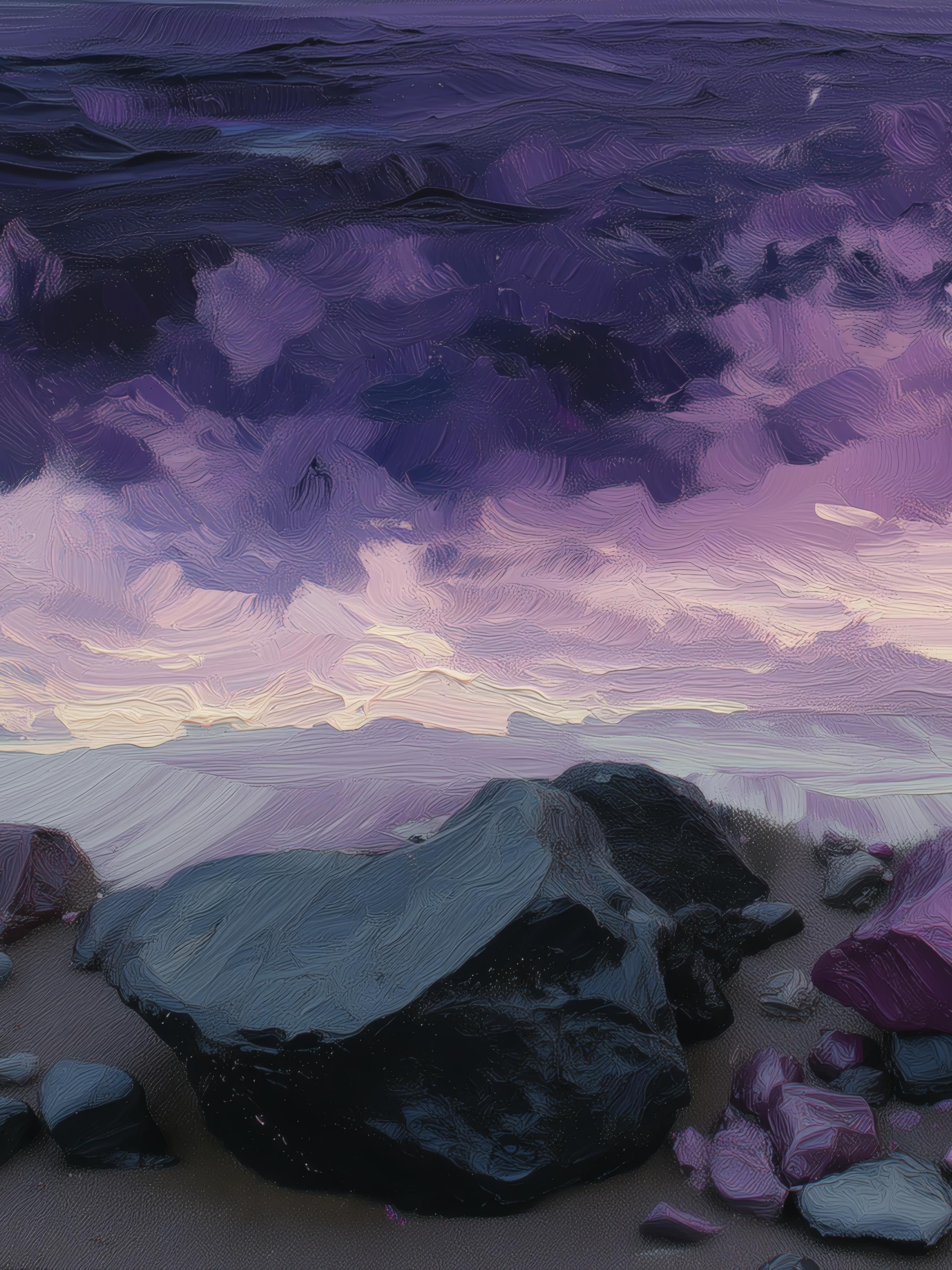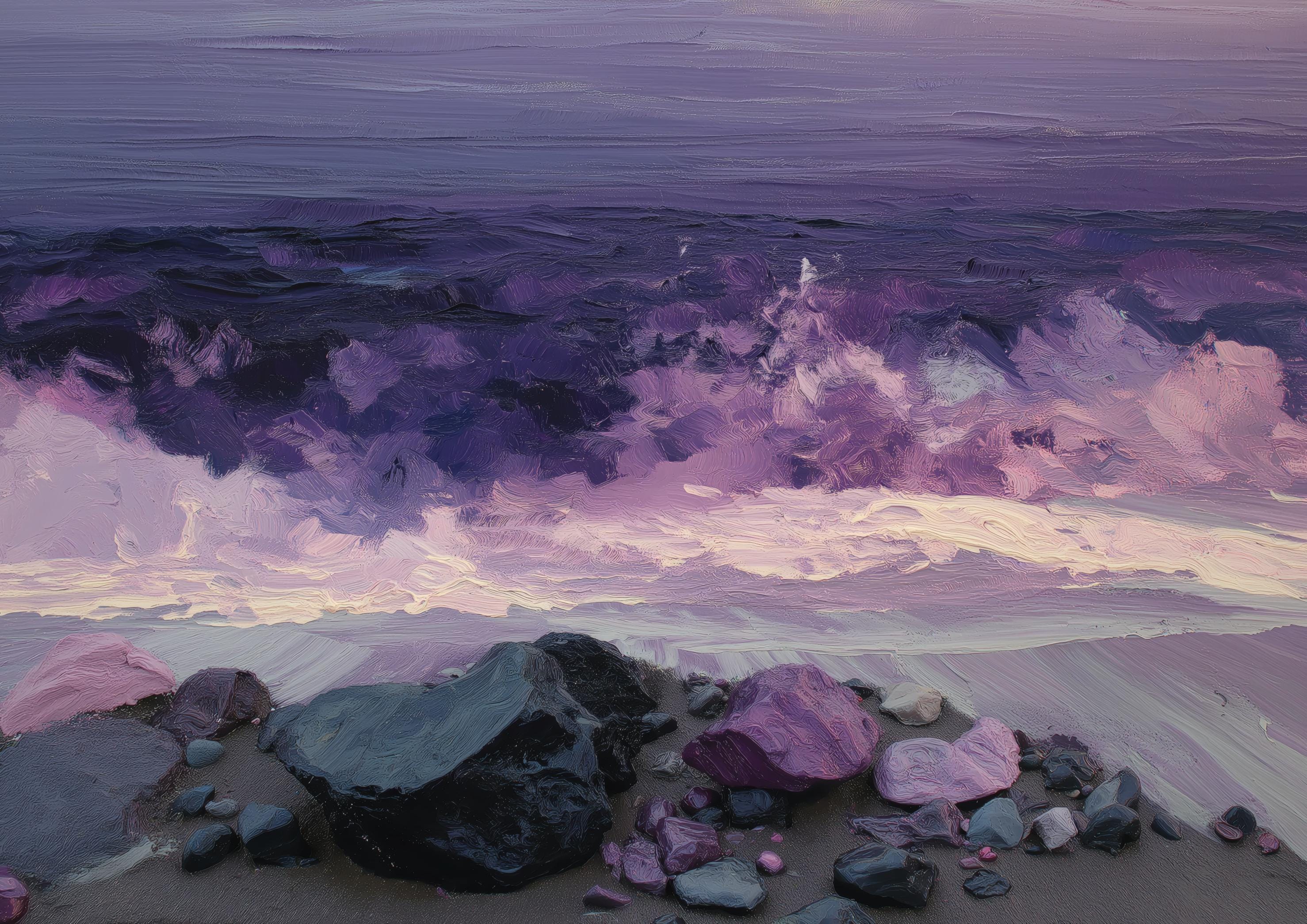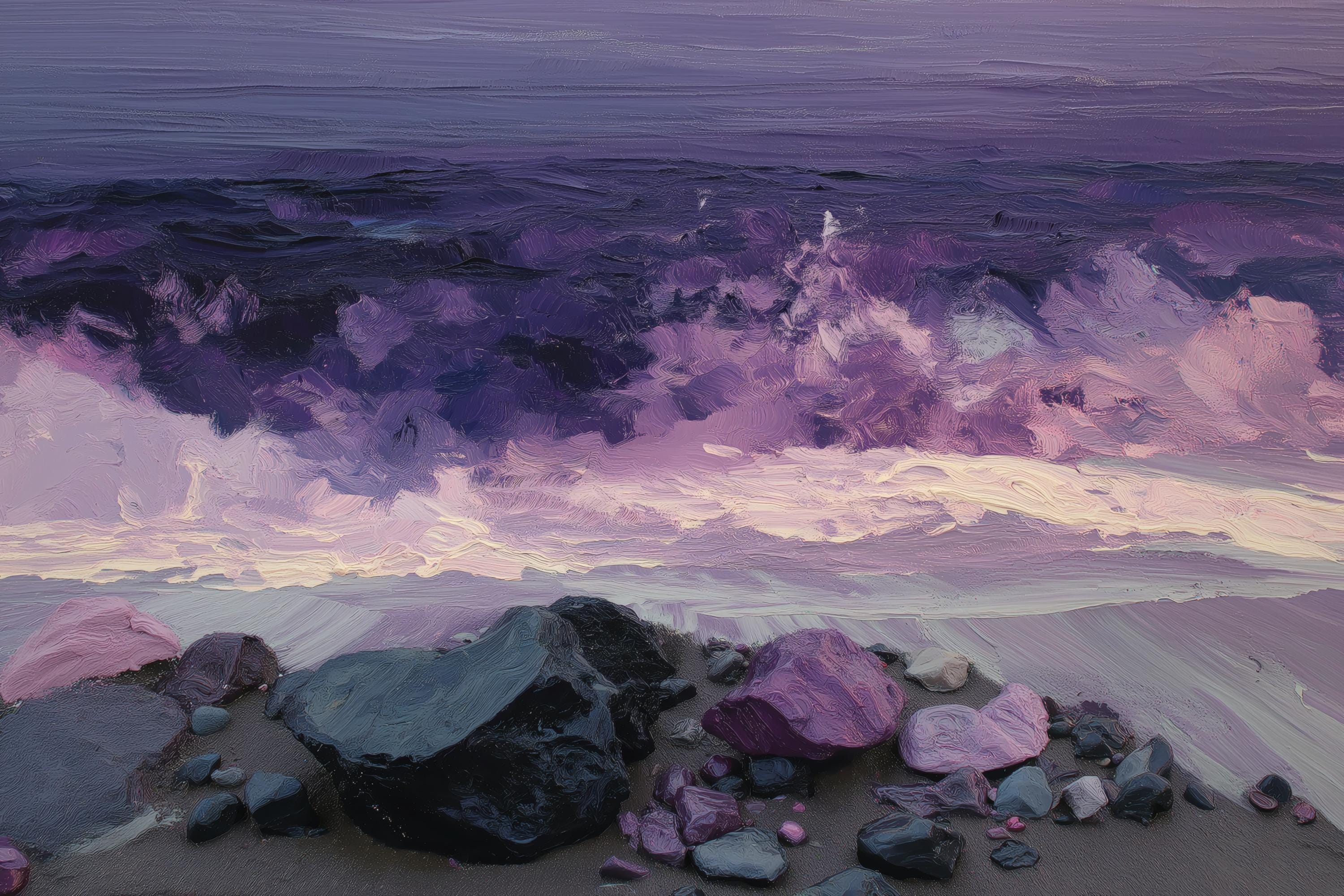 Experience the power of the sea with this impressionist purple ocean wall art. Featuring heavy, impasto-style brushstrokes, this textured coastal print captures the energy of an amethyst tide crashing against a dramatic shoreline. It’s a perfect blend of modern impressionism and abstract seascape design.