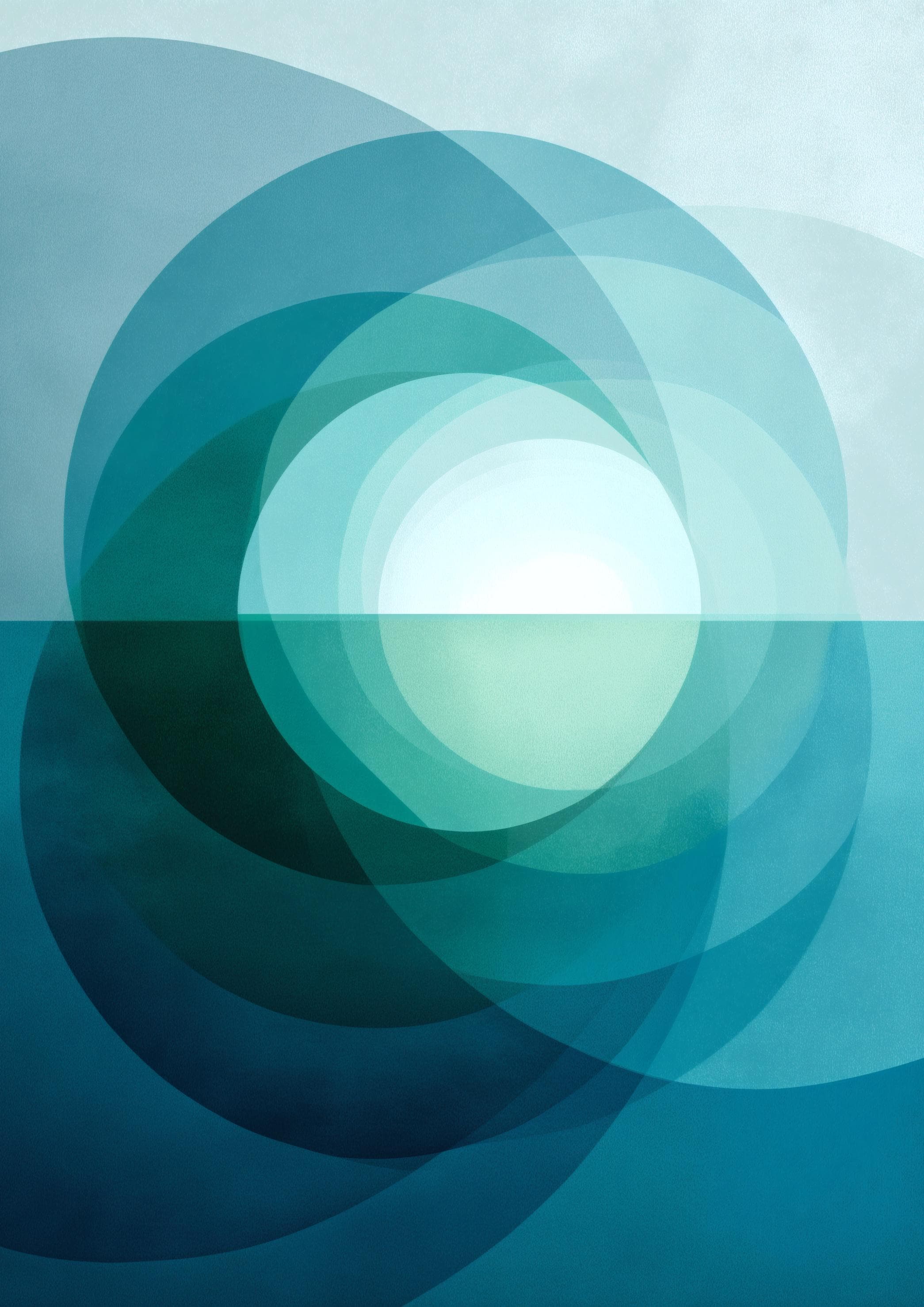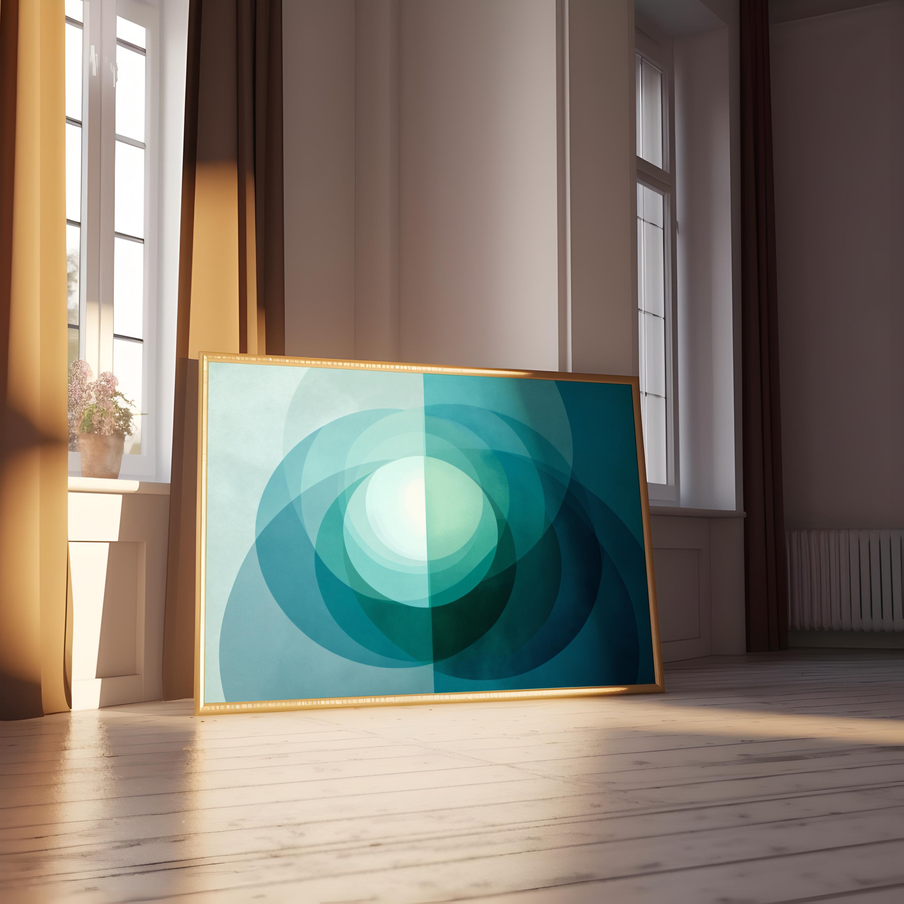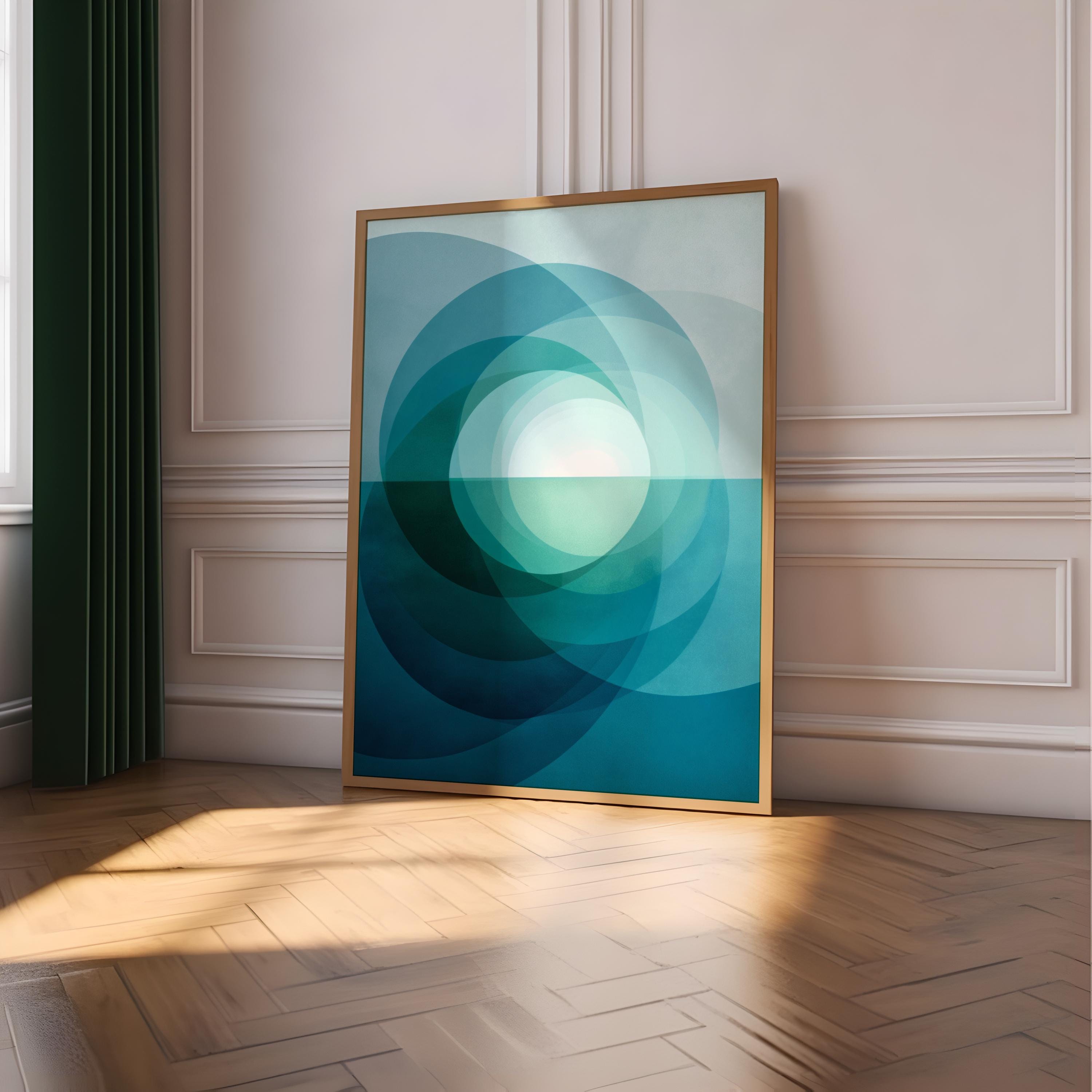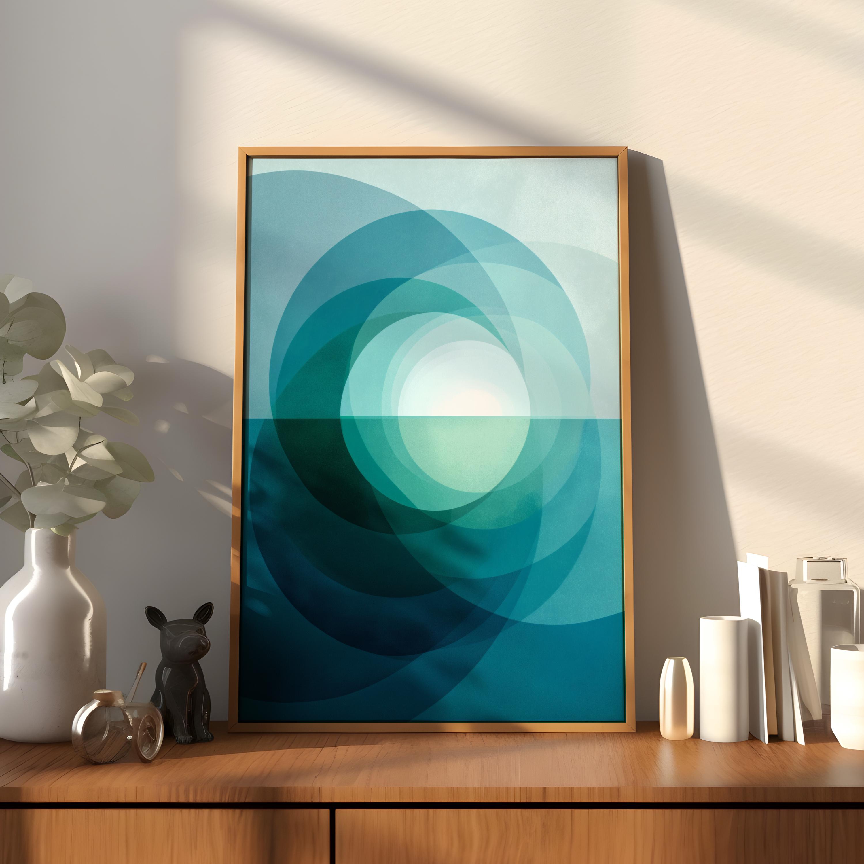 Bring a sense of serene balance to your home with this mid-century modern wall art. Featuring a harmonising blend of deep blue and soft mint green, this abstract geometric print is inspired by the quiet transition of light over a coastal horizon.