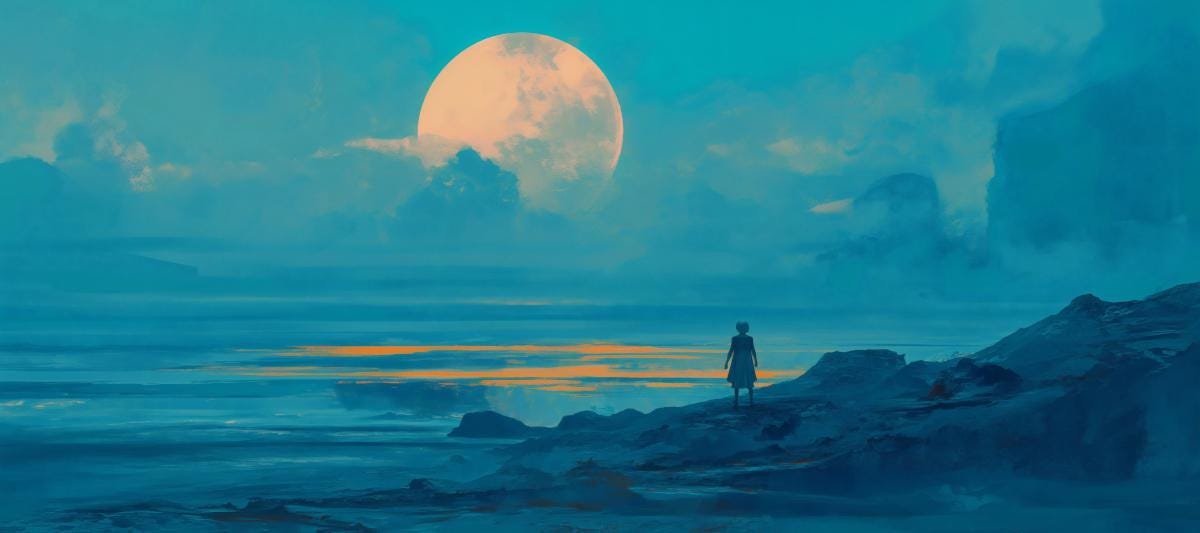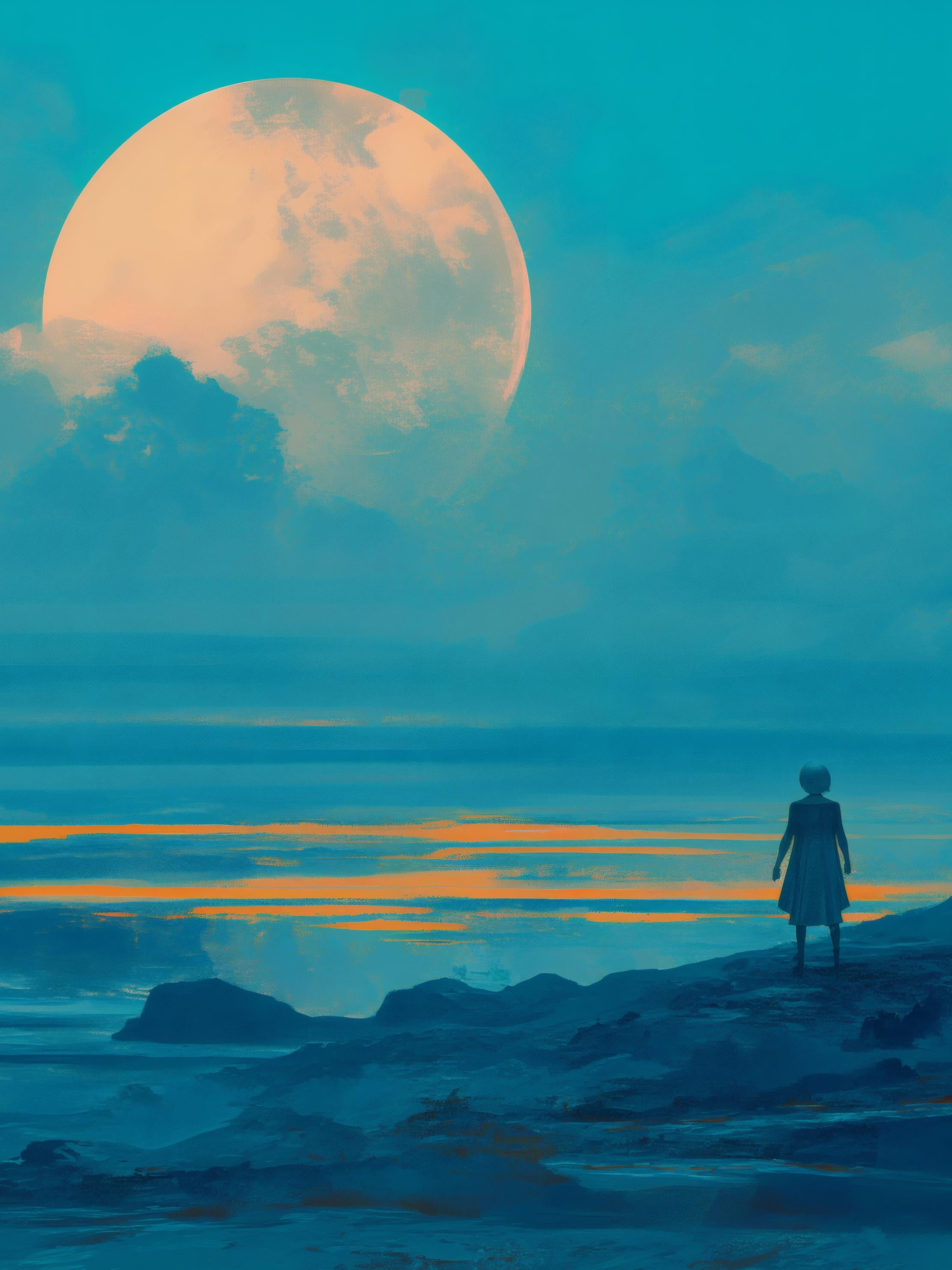 This digital download set features the "Solitude by the Sea" collection—a series of three coordinating prints designed to create a cohesive, atmospheric gallery wall. Capturing a lone figure amidst a dreamy coastal landscape, where the sea meets a luminous, oversized moon.